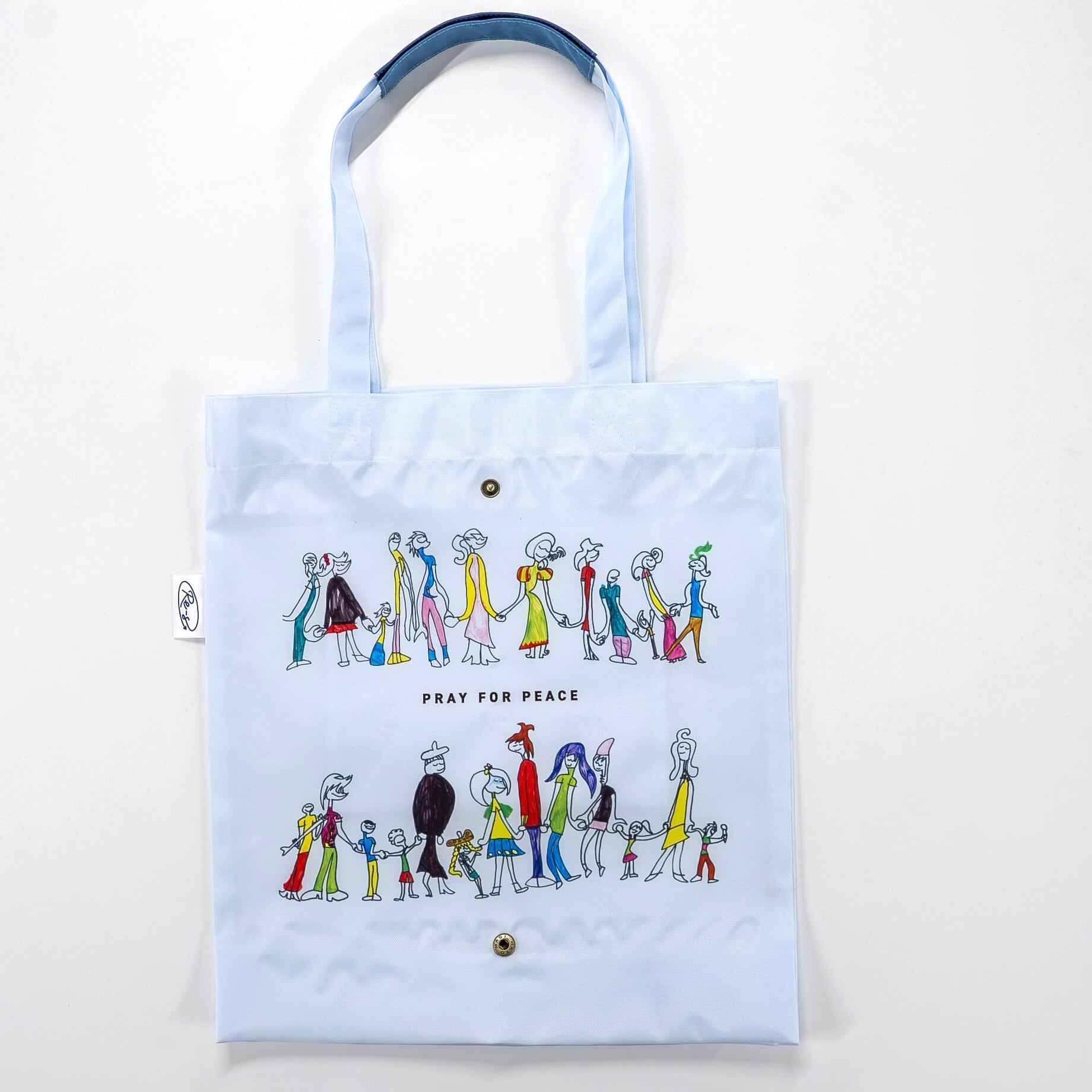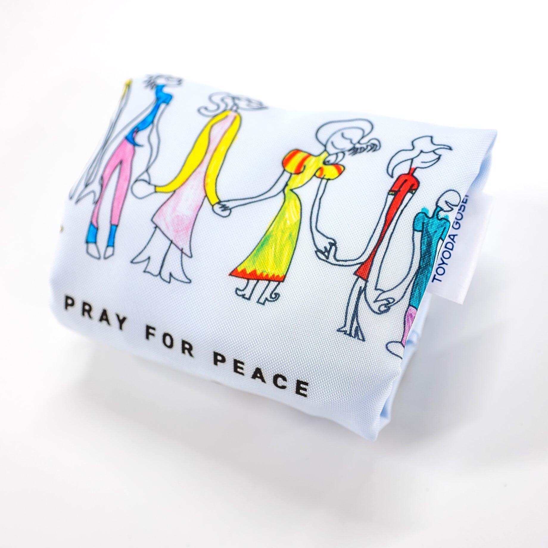 中央には「PRAY FOR PEACE」(意味:平和への祈り)と書かれています。2015年にパリの同時多発テロ事件を見て、人と人が手を取り合う姿を一筆書きで描いたJoさんの作品「Peace」がプリントされたトートバッグです。