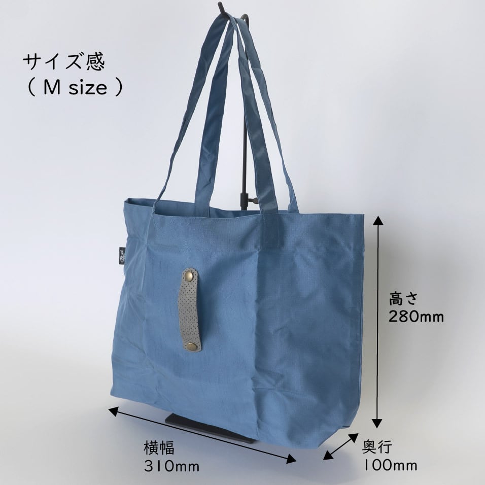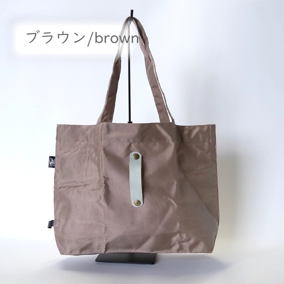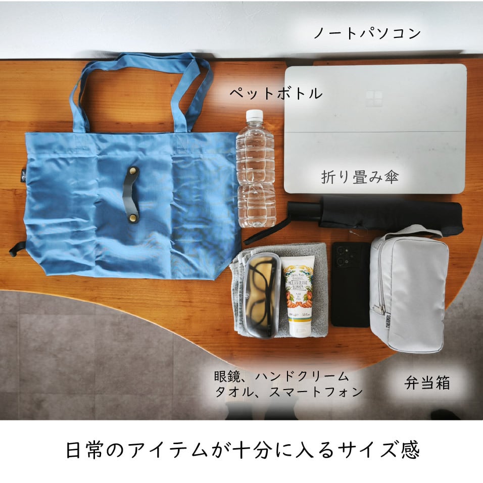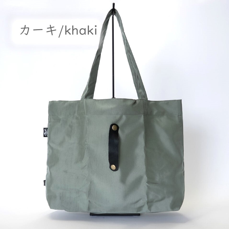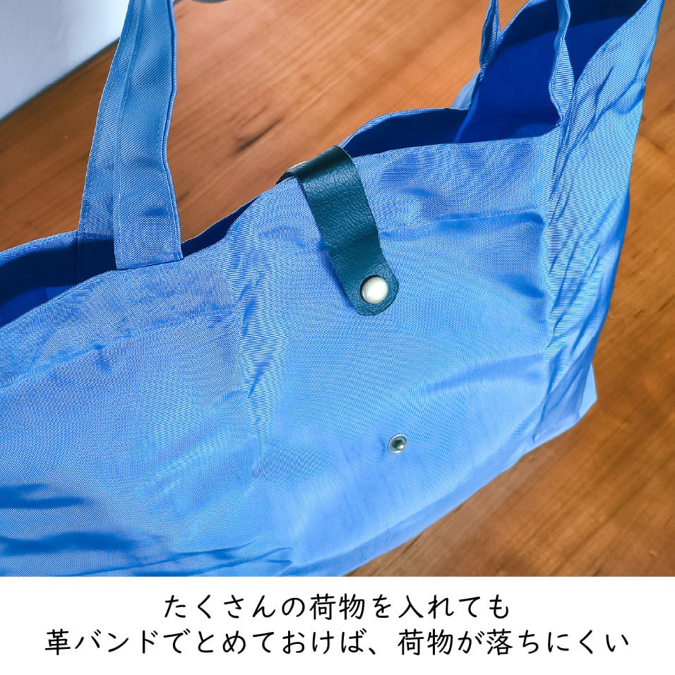 普段の買い物でのレジバッグはもちろん、水がしみにくい素材のためジムや温泉の着替え入れなど、使用シーンに応じてマルチに活躍できます。レザーバンドでバッグの閉口可能です。