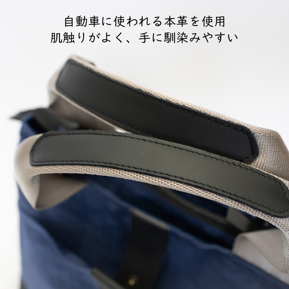 持ち手にはシートベルト、本体には本革端材など、自動車に使われる素材を組み合わせて製作。